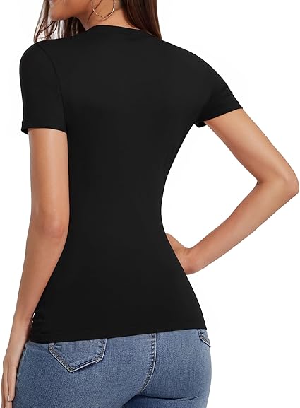 Material: slim fit t shirts for women. Made of 76% Polyamide, 24% Elastane, knit high stretch fabric. Soft and elastic, breathable, lightweight and comfortable to wear. Non see through, non fading and pilling.