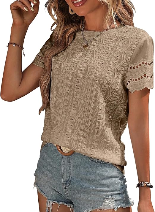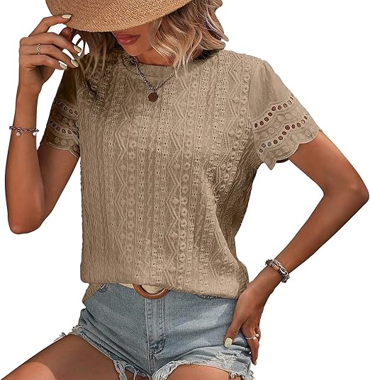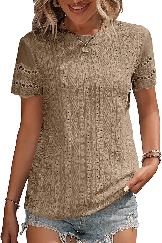 Womens Eyelet Embroidery Short Sleeve Round Neck Shirts Summer Loose Fitting T Shirt Hollow Out Top 2024