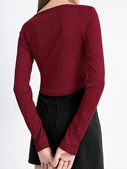 Women's Going Out Crop Tops Long Sleeve Boat Neck Knit Slim Fit Tie Up Y2K Shirts 2025 Trendy T-Shirt