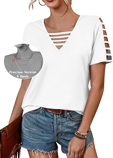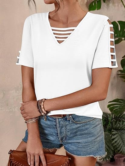 Hollow Out Design – Flattering V-Neck with unique cut-out short sleeves, perfect for a chic 2025 summer tops look.