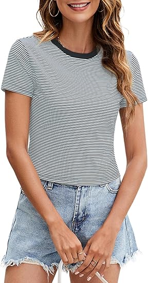Features: Embrace Y2K fashion trends with these cute baby tees, featuring classic crewneck, slim fitted and short sleeve desgin, womens striped shirts comes in both cropped and regular styles, giving you the option to wear it as a regular top or fold it up for a trendy crop tops look